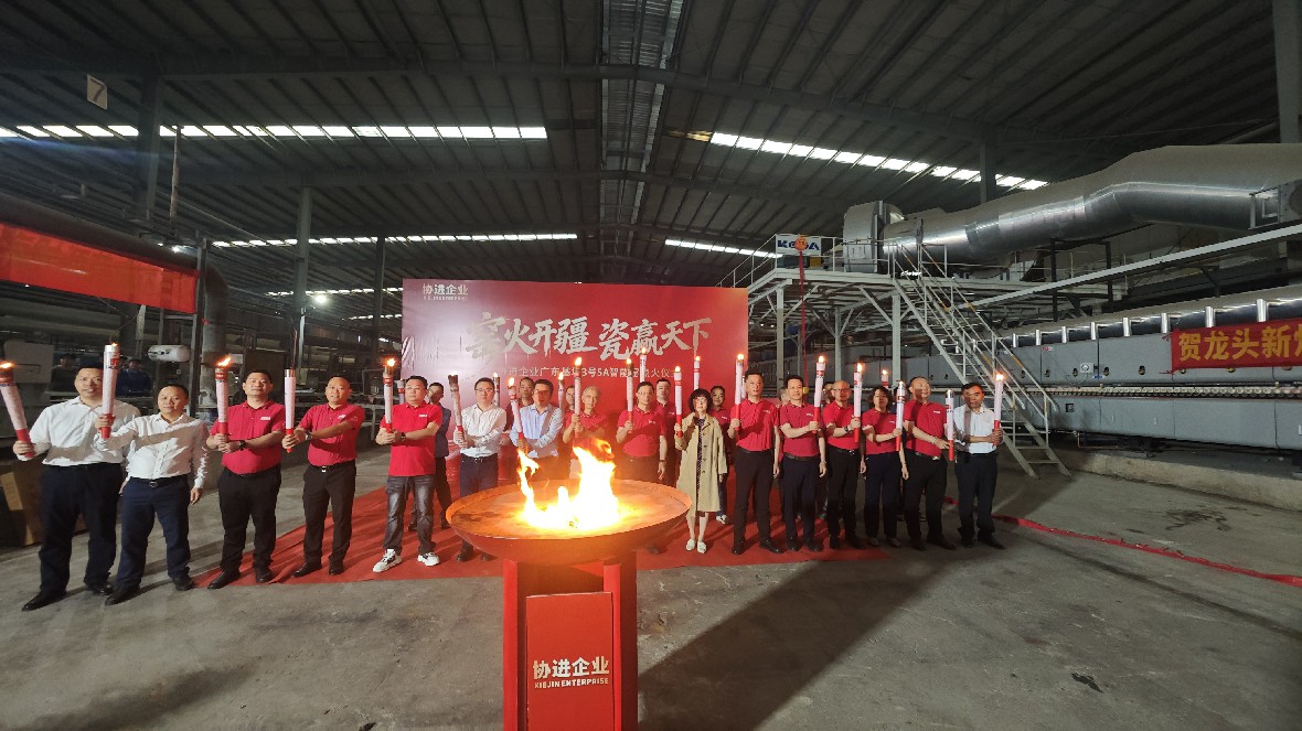 近日,在协进企业广东肇庆生产基地,科达陶机为协进企业建造的第10条窑炉——3号5A智能窑成功点火。