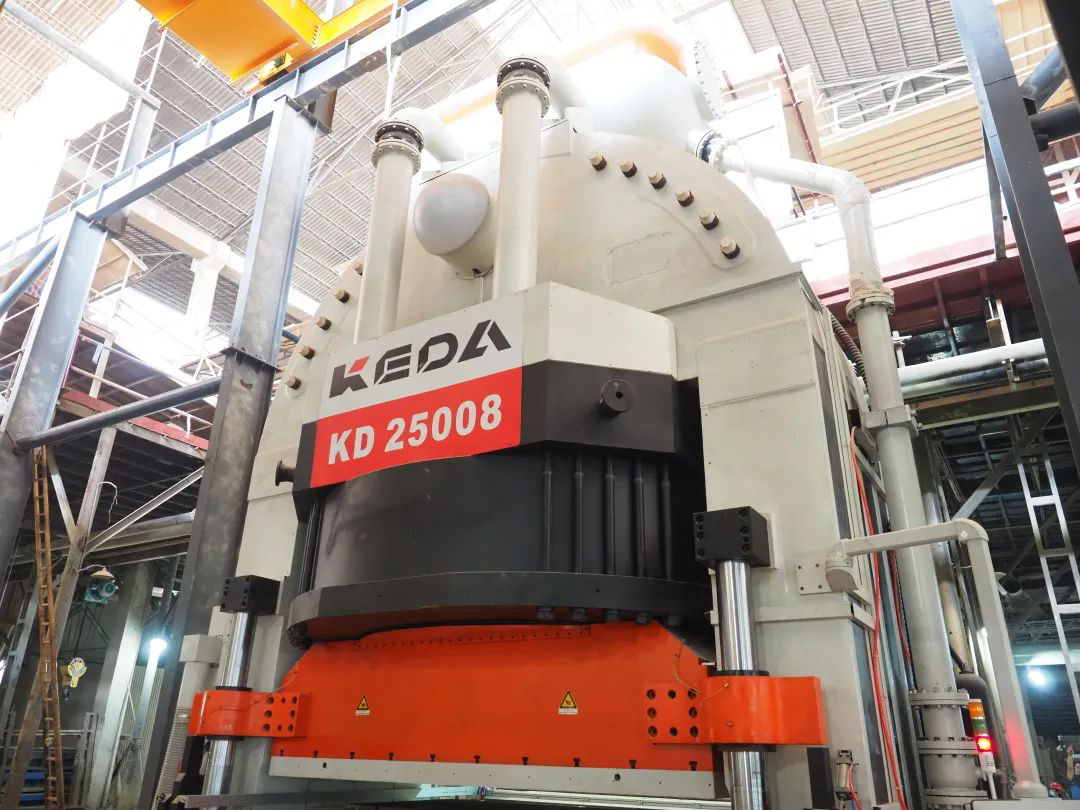 在广东中盛稳定运行的全球最大吨位圆缸陶瓷压机KD25008最大压制规格达到了1600×3000(mm)。其最大优势在于保持了与传统陶瓷压机在压制工艺、操作习惯、安装维护等方面的一致性,同时,岩板生产线上的其它设备无需针对压机做设计改动,兼容性更强,是企业生产3米内岩板更稳定可靠的选择。