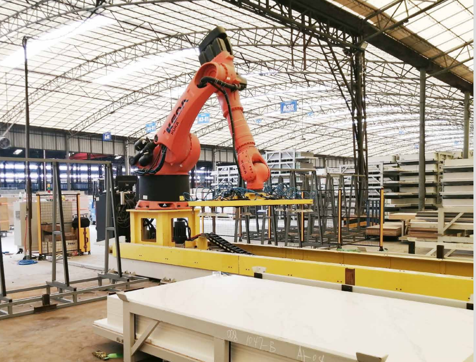 七轴机器人工作方式灵活,可以多工位同时拼装多批次大板、岩板。机器人通过行走轨道准确将连纹砖或者不同花色的同规格大板/岩板,按发货订单拼装到A形支架或者平木托上,极大地提高了生产效率,改善了作业环境。