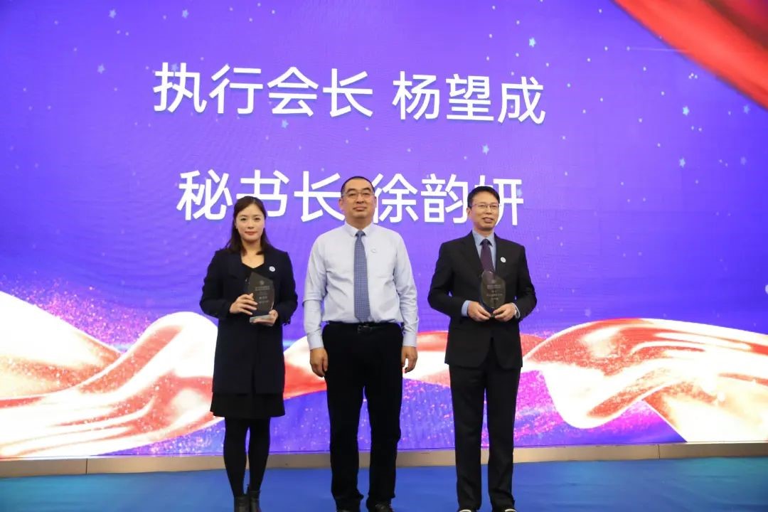 边程会长为第九届执行会长杨望成、秘书长徐韵妍以及常务理事会成员授牌