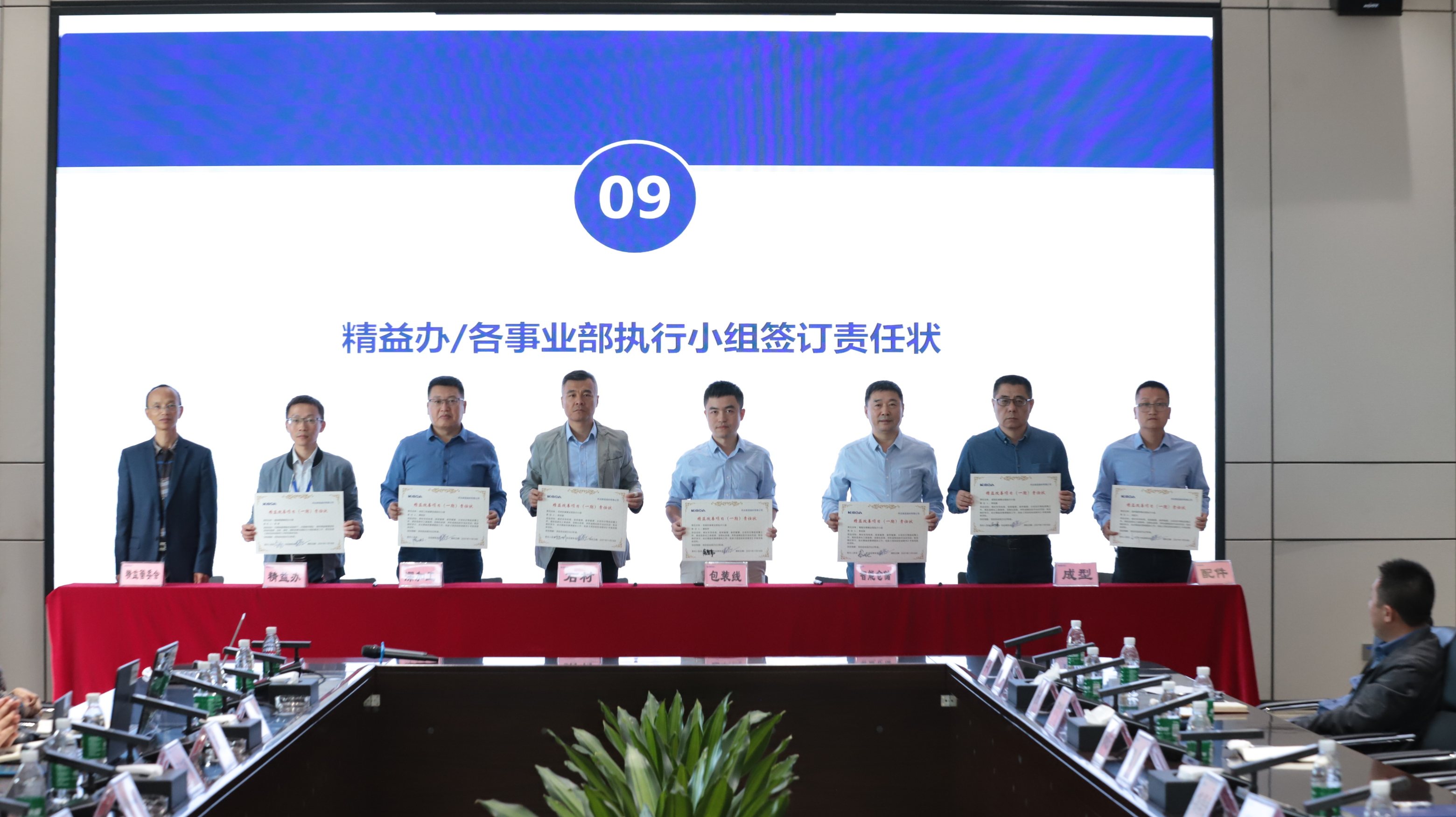 杨总随后向中普咨询项目总监余一颁发精益项目授权书,并与精益办、各事业部执行小组负责人签订了责任状。会议最后,全体参会人员在科达陶机精益办主任李杨的带领下进行项目实施宣誓,并在项目实施决心书上郑重签上了自己的名字。