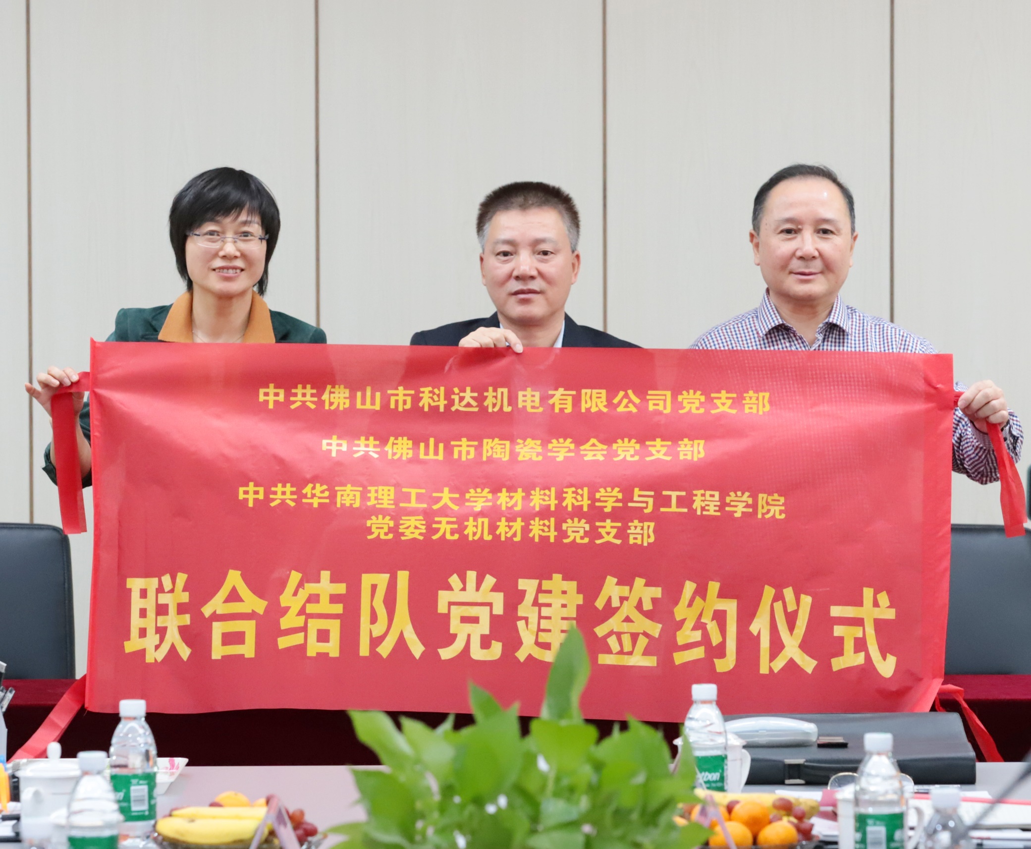 佛山市陶瓷学会副理事长及党支部书记黄惠宁、佛山科达机电总经理陈水福、华南理工大学材料与工程学院副教授及党支部宣传委员王慧进行了签约。