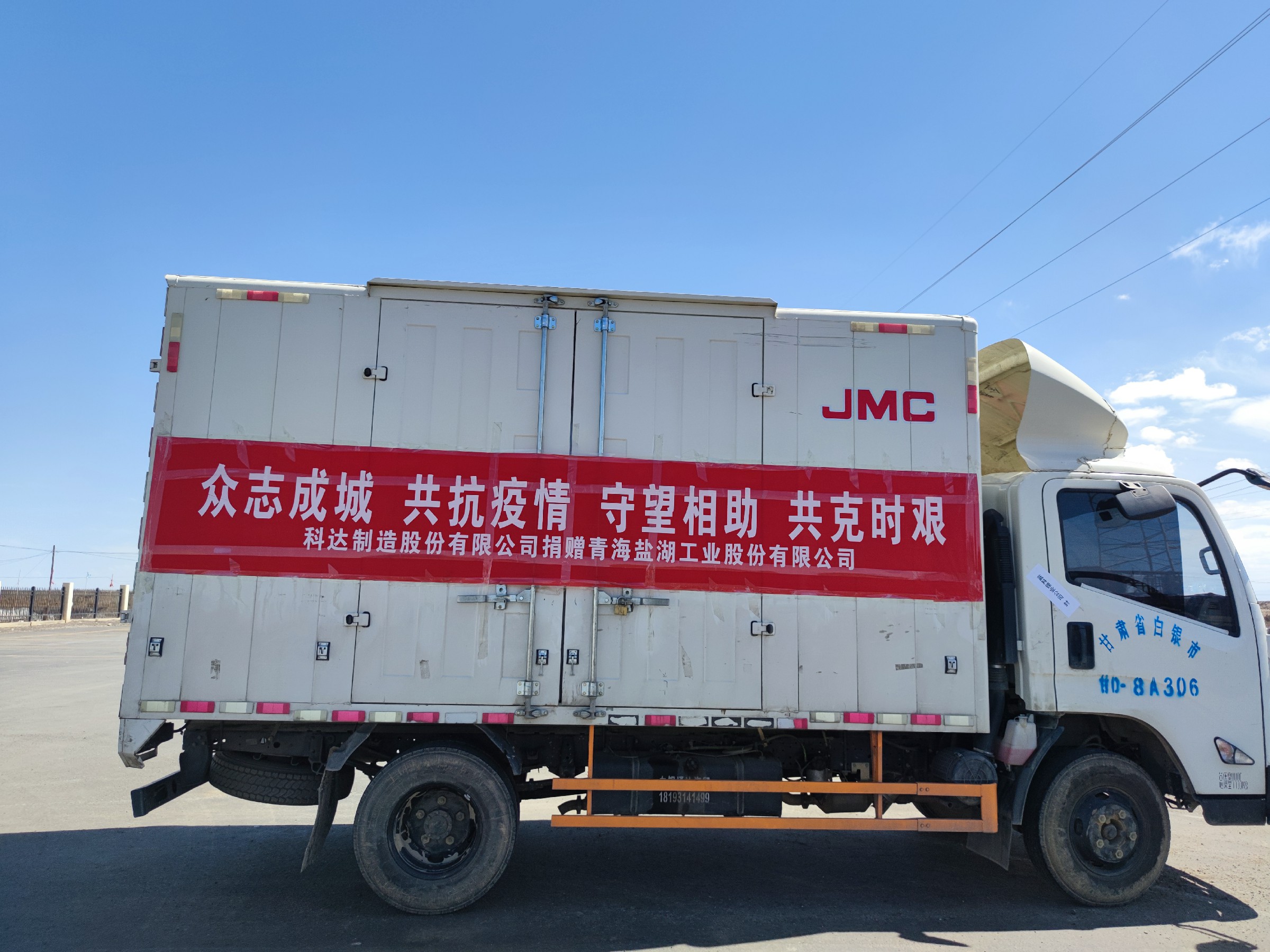 9月4日,数辆挂着“众志成城 共抗疫情 守望相助 共克时艰”红色横幅的货车,满载着科达制造采购的生活和医用物资,驶向青海盐湖股份旗下蓝科锂业公司。科达制造捐赠的三批物资已全部到位。