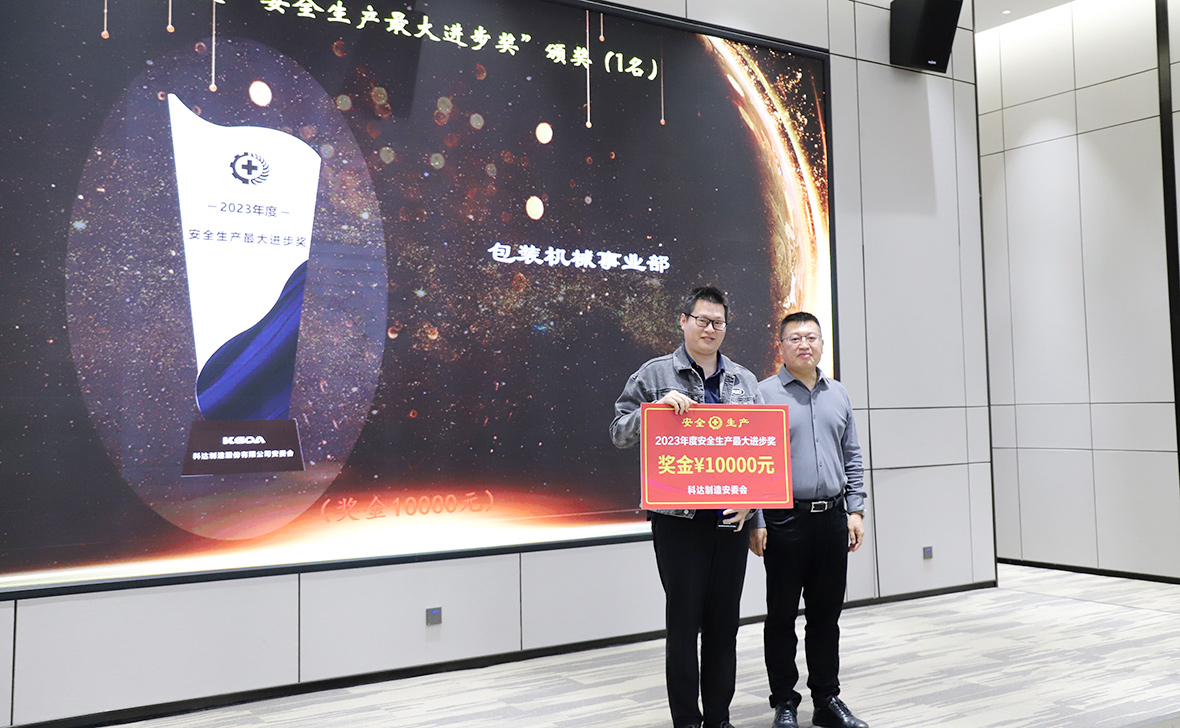 在总结汇报后,科达陶机安委会隆重举行了2023年度“最佳安全(消防)员”、“优秀安全班组”、“最佳安全生产部门(车间)”、“优秀安全生产经营单位”和“安全生产最大进步单位”表彰颁奖仪式,获奖单位代表和个人在催人奋进的颁奖曲中登台领奖。