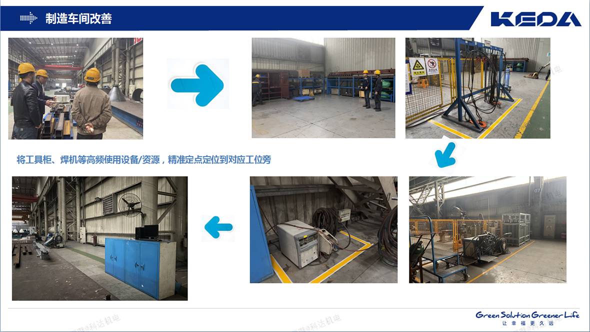 安徽科达机电深度聚焦作业效率,系统性地将工具柜、焊机等高频使用设备/资源,精准定点定位到对应工位旁。大幅减少了设备拖曳、接驳的时间浪费和安全隐患;总装车间则利用呆滞物料改制智能电控桩,实现集成化作业,提高了装配效率的同时又改善了现场环境。这一系列定点布局优化,显著缩短了操作人员的非增值走动和准备时间,让员工能将更多精力集中于核心价值创造,生产效率得到切实提升!
