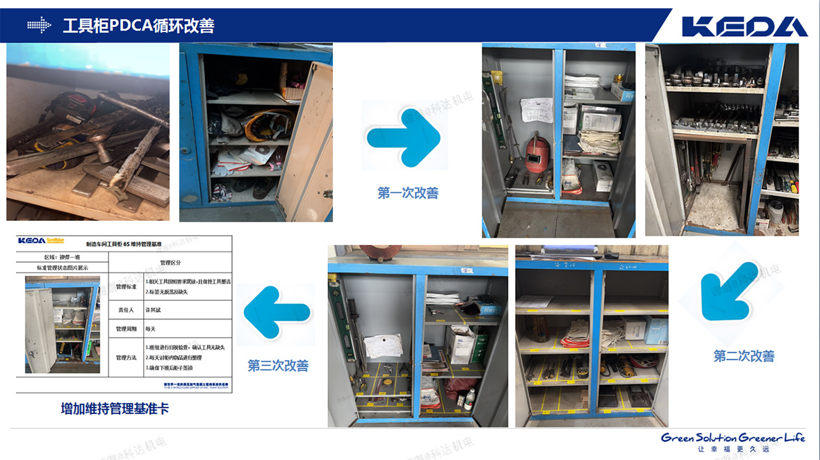 针对工具柜内部杂乱、找寻耗时的问题,安徽科达机电深入推行了工具柜目视化与形迹化管理。通过定位标识、可视化标签,实现了工具“一目了然、伸手即得”,大大减少了找寻时间,提高了工作效率。为巩固成果,每个工具柜都醒目张贴了专属的《工具柜6S维持管理基准卡》。通过“目视标准+责任到人+日常点检”的闭环机制,确保了改善成果的长效维持,使工具柜管理真正成为现场精益化、标准化的标杆!