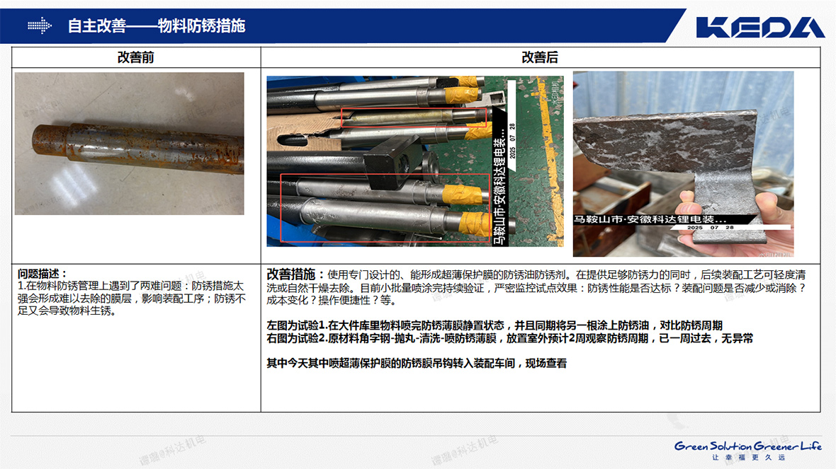 在“物资管理”持续改善的过程中,物资组成员结合产品特性和存储环境,主动提出改进包装方式、优化防锈油使用与存储,并定期进行检查与维护,有效延长了在制品和库存物资的防锈周期,降低了因锈蚀导致的损失和质量风险。