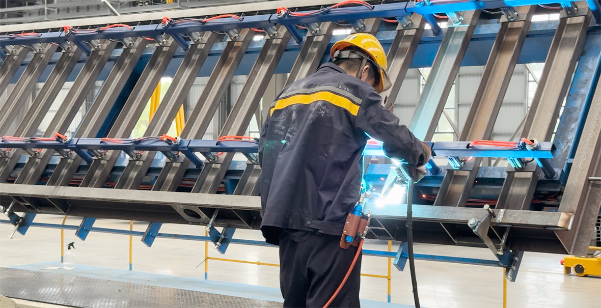 技术革新驱动质效跃升:安徽科达机电通过智能化、模块化工装技术重构生产逻辑,实现质量、效率、成本的同步突破!其中,新厂房引入高精度焊接机器人,激光实时修正焊缝轨迹,消除人工抖动误差,关键结构件焊接合格率达100%;引入双工位伺服变位机,实现工件0-360°无极翻转,水平焊、立焊、仰焊自动切换,消除人工翻转的安全隐患,多角度焊缝一次合格率提升至100%;工艺开发气动楔形锁紧夹具,换型时“一插一拔”3秒完成定位切换。