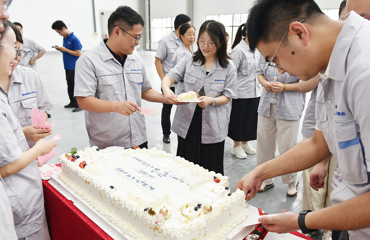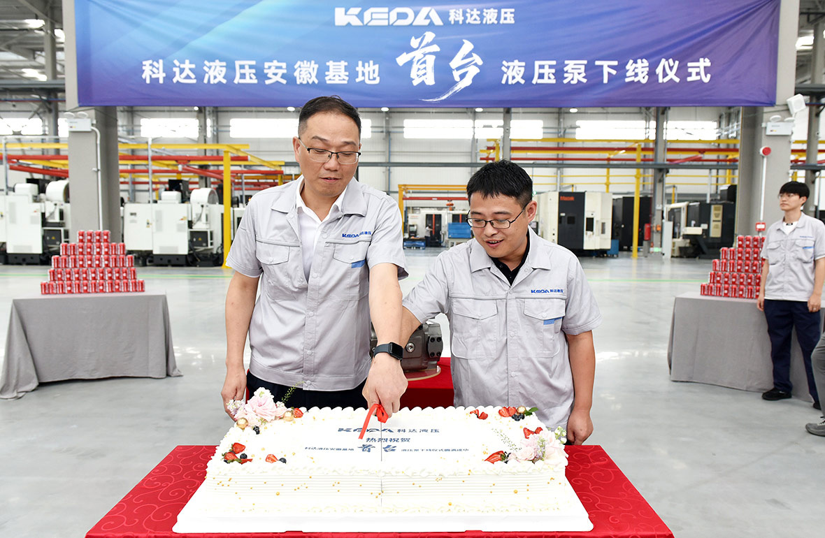 随后,在全场瞩目下,科达液压总经理陈孝辉和常务副总经理刘正富共同为首台液压泵揭幕。此次下线的K4V200液压泵是科达液压广受市场欢迎的产品。该产品凝结了研发技术团队的智慧与汗水,从设计到生产全流程彰显了科达液压“精益求精”的匠心精神,是公司核心研发与制造实力的集中体现。仪式最后,陈总和刘总与全体员工共同分享象征着成功与喜悦的蛋糕,期望科达液压的未来更加甜蜜与美好。