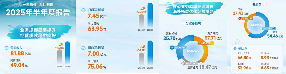 8月25日晚间,公司发布2025年半年度报告。报告显示,2025年上半年科达制造实现营收81.88亿元,同比增长49.04%,创历史同期新高,其中海外收入占比超65%,较去年同期进一步提升;归母净利润为7.45亿元,同比增长63.95%。