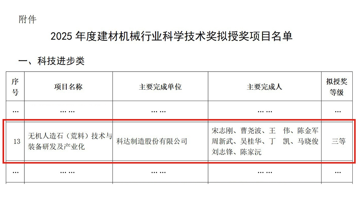 日前,中国建材机械工业协会公布2025年度建材机械行业科学技术奖入围名单,科达石材机械的“无机人造石(荒料)技术与装备研发及产业化”荣获“科技进步类”三等奖。