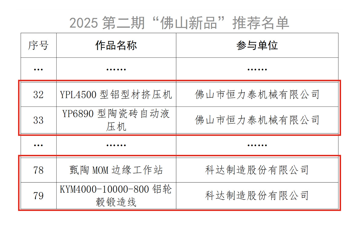 继2025年3月公布第一批“佛山新品”目录后,近日,佛山市工业和信息化局再度公布第二批入选“佛山新品”的产品名单。共有113款不同领域的创新新品进入榜单,其中,科达制造及子公司恒力泰机械各有两款产品入围。