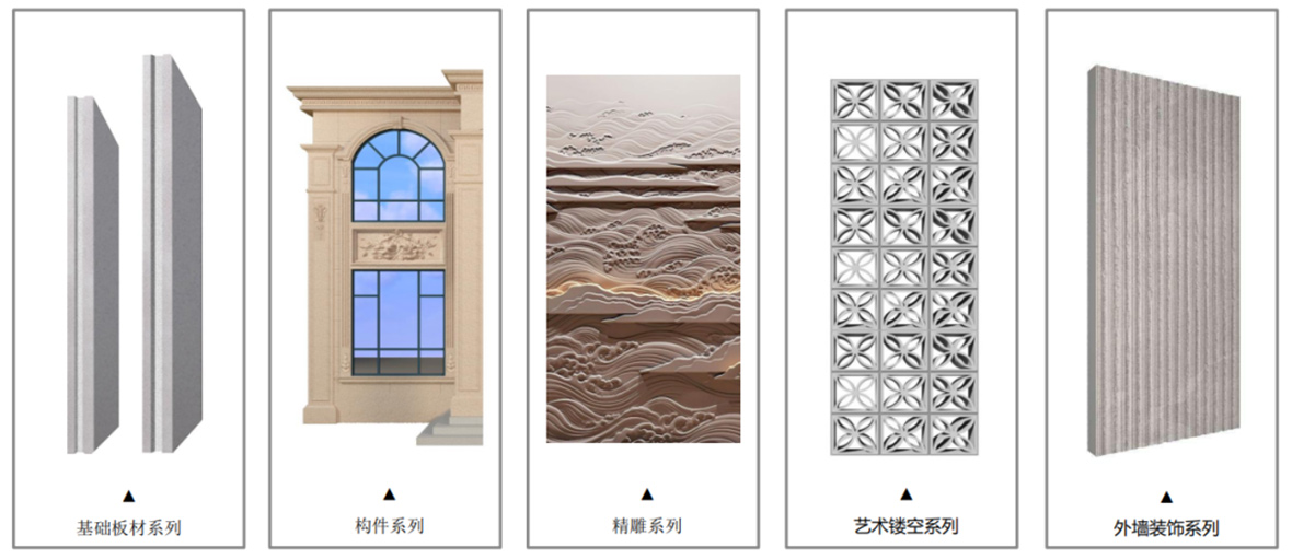 历经近10年的工业化生产和市场教育,当前发泡陶瓷的市场应用范围不断扩大,已细分为基础板材系列、构件系列(窗套类、柱子类、平线类、檐口类、护栏类)、精雕系列、艺术镂空系列、外墙装饰系列等。其中,外墙装饰应用体量尤为庞大,正逐步替代传统水泥制品。