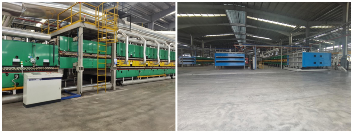 此外,第六代发泡陶瓷辊道窑生产线还增加了窑前干燥窑,利用烟气余热升高粉料和窑具温度,达到节能效果;窑尾新增双层保温箱体段,解决了切割裂的问题;并通过使用新型窑具棚板,加快了底部产品升温/降温速度。