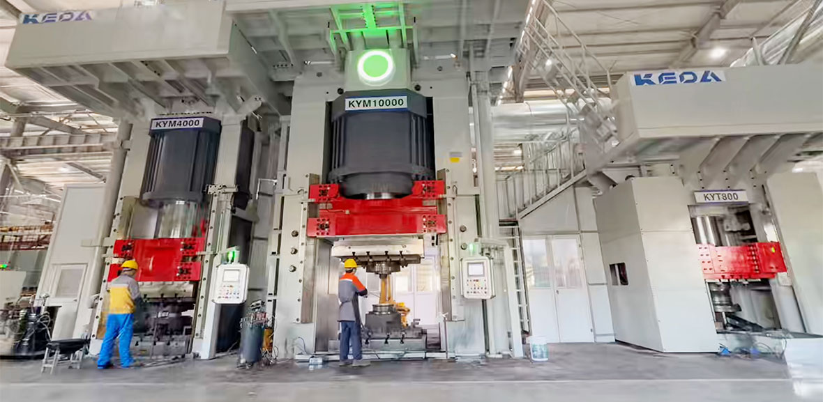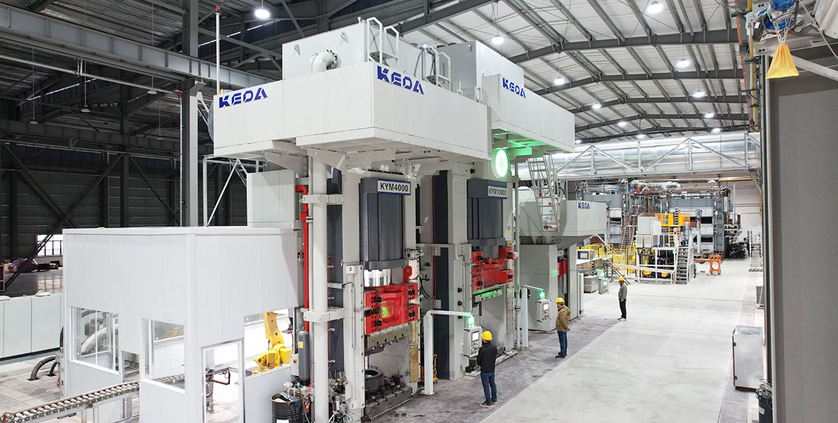 该项目包含3台科达陶机的KYM系列铝轮毂锻造液压机和1条KYSX自动输送线,针对铝合金锻造时流动性差、易粘模、锻造温度区间较窄、对应变速率较为敏感等特点做了大量优化,尤其是在压机的结构精度、刚性、抗疲劳性能、抗集中载荷和抗中温蠕变性能,以及在液压和电气控制的稳定性、准确性、快速响应性上进行了针对性设计,锻造线长期运行稳定、可靠、高效。