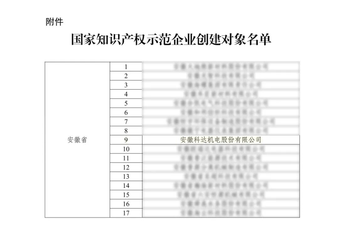 其中,国家知识产权局近日在官网发布《国家知识产权局关于确定2025—2027年国家知识产权强国建设示范创建对象的通知》,安徽科达机电凭借在核心技术自主创新、知识产权创造与运用、知识产权管理体系建设等方面的突出表现成功入选国家知识产权示范企业创建对象,这标志着公司知识产权工作再获国家级认可,迈入高质量发展新阶段。