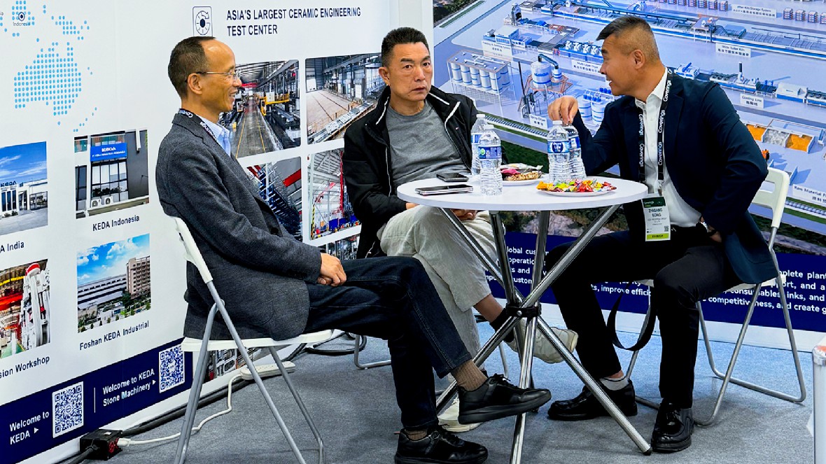 从人造石智能整厂解决方案到天然石智能整厂解决方案,科达石材机械在本次展会上展示了从原料配比到成品产出的全流程自动化能力。众多客户在现场与科达石材机械深入探讨了整厂规划与产线升级的合作可能。