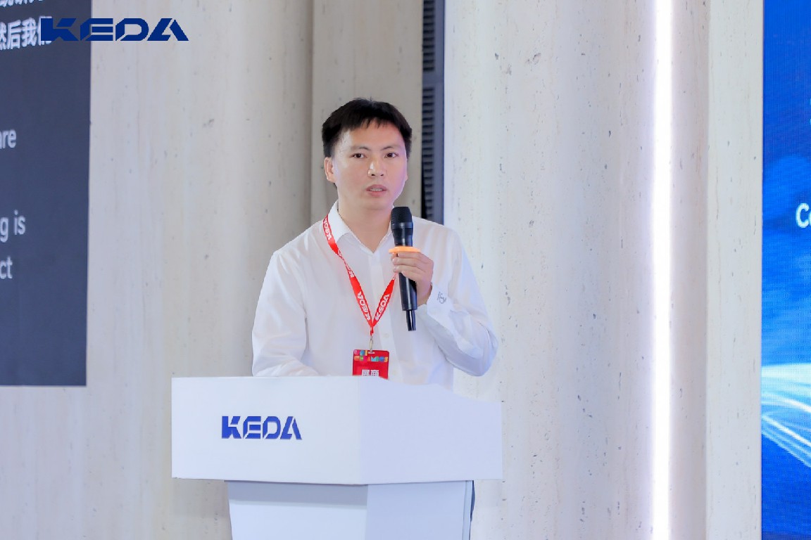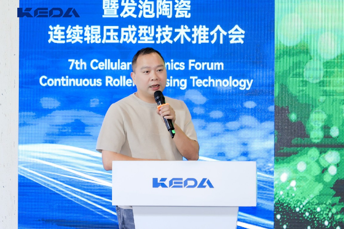 在主题分享环节,科达陶机成型机械事业部技术总监曹飞率先以《Extenller连续辊压成型成套装备》为题展开介绍。曹总表示,科达陶机研制的Extenller系列陶瓷板连续辊压成型成套装备,是针对国内陶瓷厂粉料特性与生产工艺开发的新型成型设备,主要适配大规格陶瓷大板/岩板、薄板的生产需求,具有粉料适应性强、日产量高、能耗低、柔性快速转产、废料量少、成型质量优异、场地适应性强、环境友好等众多优势。该辊压成型成套装备同样适用于发泡陶瓷生产,相比发泡陶瓷传统堆粉成型工艺,其成型强度更高,可实现一体成型,尤其适用于厚度5cm以下的发泡陶瓷薄板;烧成周期更短,能耗降低40%;支持裸烧方式,无需垫板、围边、高温纸等窑具,有效节约生产成本;且具备柔性化生产能力,转产快捷,更能满足多规格、小批量、定制化的生产需求。