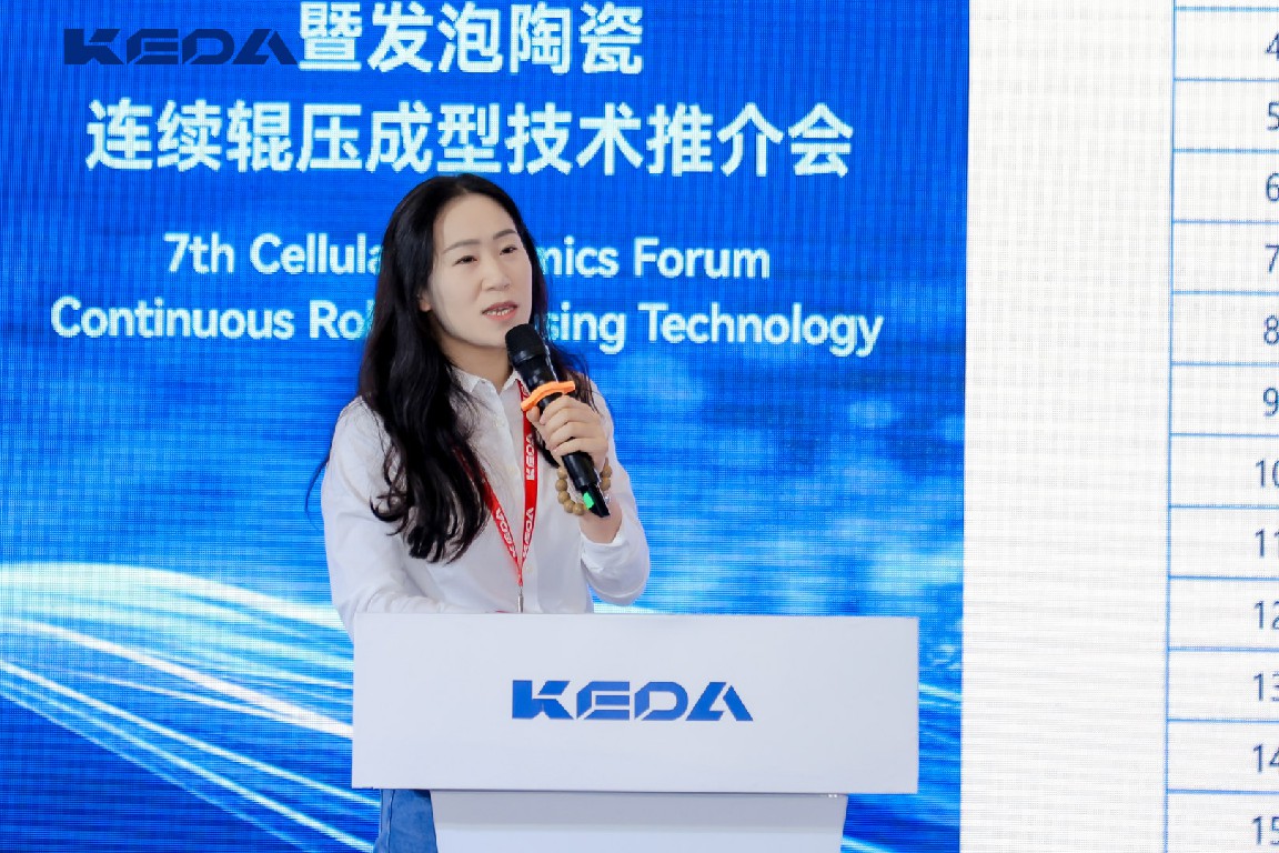 科达陶机陶瓷工艺研究所工艺工程师王哲则围绕发泡陶瓷连续辊压成型工艺,分享了陶瓷工艺研究所在这一领域的研究成果。通过反复试验,团队得出适用于连续辊压机干压成型工艺的产品配方结构、成型压力参数及烧成温度曲线,并在中试阶段对整体工艺流程进行了优化,完成试制样品的性能检测。她指出,“发泡陶瓷连续辊压成型工艺技术”的成功研发将为发泡陶瓷产业带来颠覆性的变革:不仅提高生产效率、减少围边、高温纸等生产耗材的使用、缩短烧成周期、降低能耗,同时自动化程度高,满足客户对薄型发泡陶瓷多品种、多规格、小批量、定制化的生产需求,实现快捷转产。同时,成型方式的改变减少了切片机、回板线等设备的投入成本,也在一定程度上节约了厂房空间。