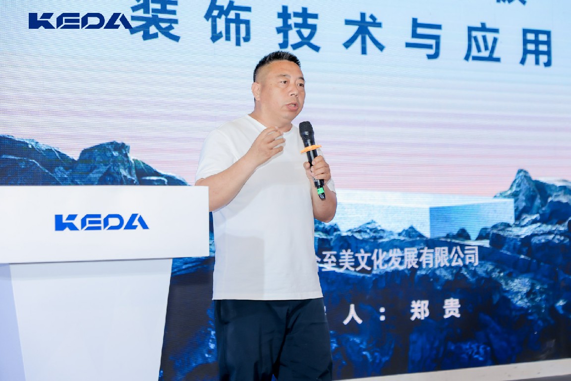 随后,佛山市昂泰新材料有限公司副总经理李立宇、佛山市蓝之鲸科技有限公司副总经理李金华、武汉融合至美文化发展有限公司总经理郑贵,分别从发泡陶瓷表面装饰、复合增强技术、装饰技术与应用三个专业维度,介绍了薄型发泡陶瓷领域最新技术方案及应用方向,包括无机免烧喷墨打印装饰技术、多样饰面复合增强技术、涂料饰面赋能造型基底等内容。